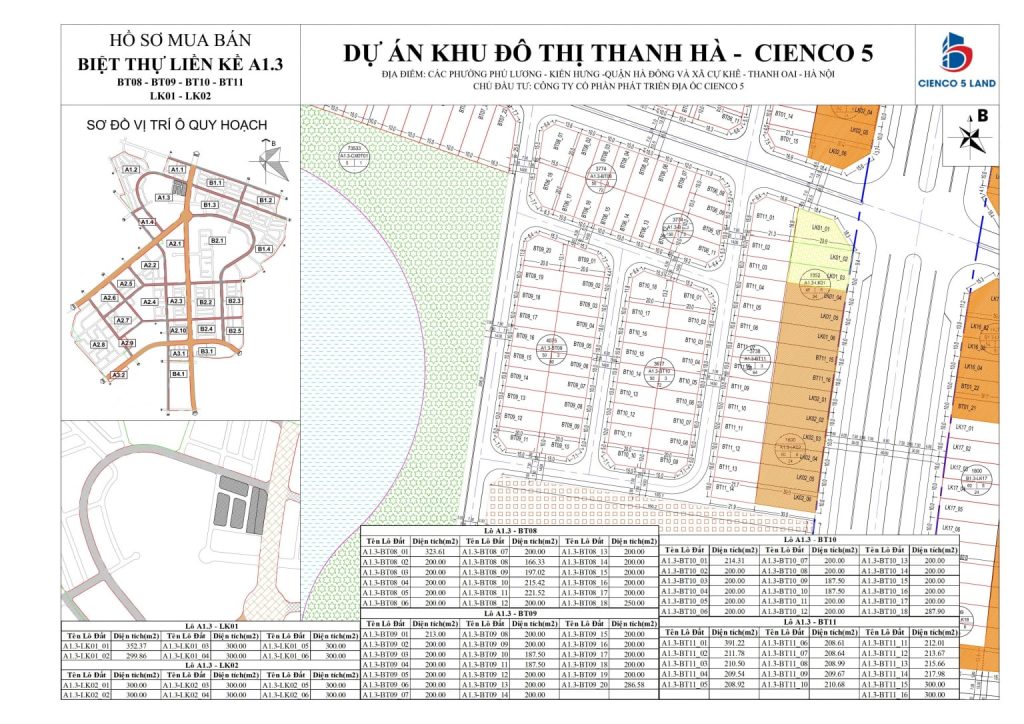Cienco5 Land trân trọng gửi tới Quý khách hàng sơ đồ mặt bằng Phân khu A1.3 KĐT Thanh Hà Mường Thanh. Phân khu A1.3 Thanh Hà gồm 02 block Liền kề Shophouse, 11 block Biệt thự.