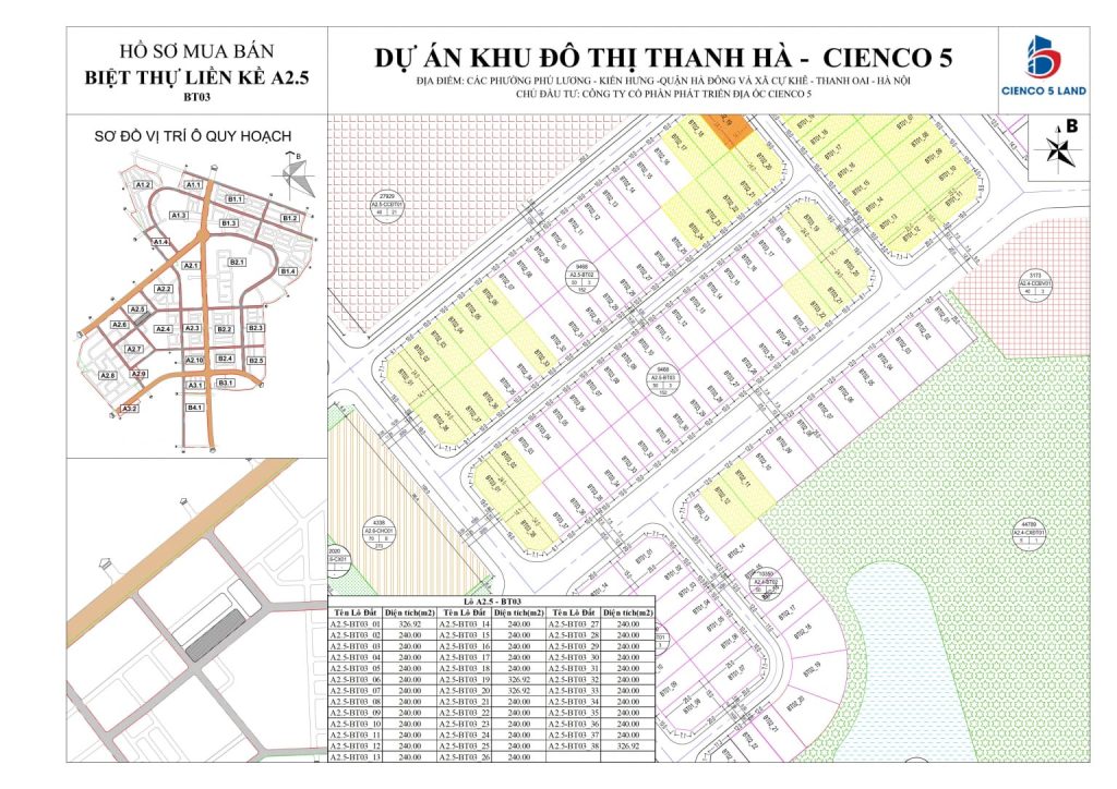 Cienco5 Land trân trọng gửi tới Quý khách hàng sơ đồ mặt bằng Phân khu A2.5 KĐT Thanh Hà Mường Thanh. Phân khu A2.5 gồm 05 block Biệt thự.